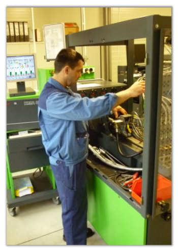 Er ist speziell zur Prüfung von magnetventilgesteuerten Verteilerpumpen (VP29/30/44) und kann auch für CommonRail Hochdruckpumpen und Injektoren, sowie konventionelle Reihen- und Verteilerpumpen genutzt werden. Hier wird als Bsp. eine VP44 von unserem Mitarbeiter Herrn Epp ihrem Prüflauf unterzogen. Zuvor wurde die Pumpe geprüft, komplett zerlegt, gereinigt und alle Verschleißteile erneuert.